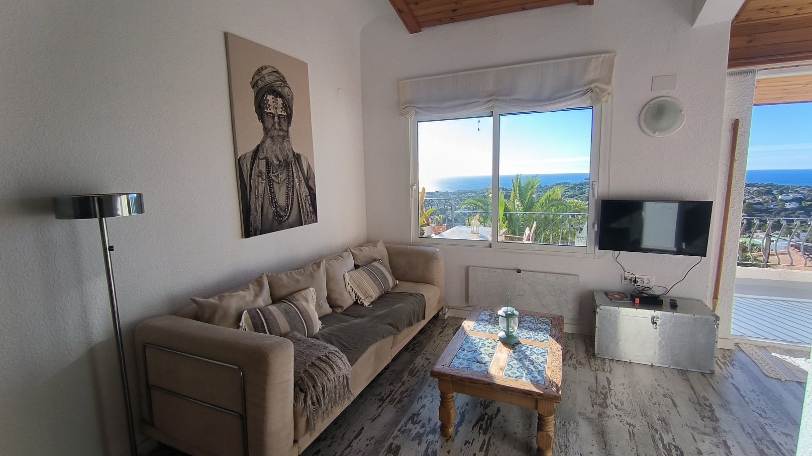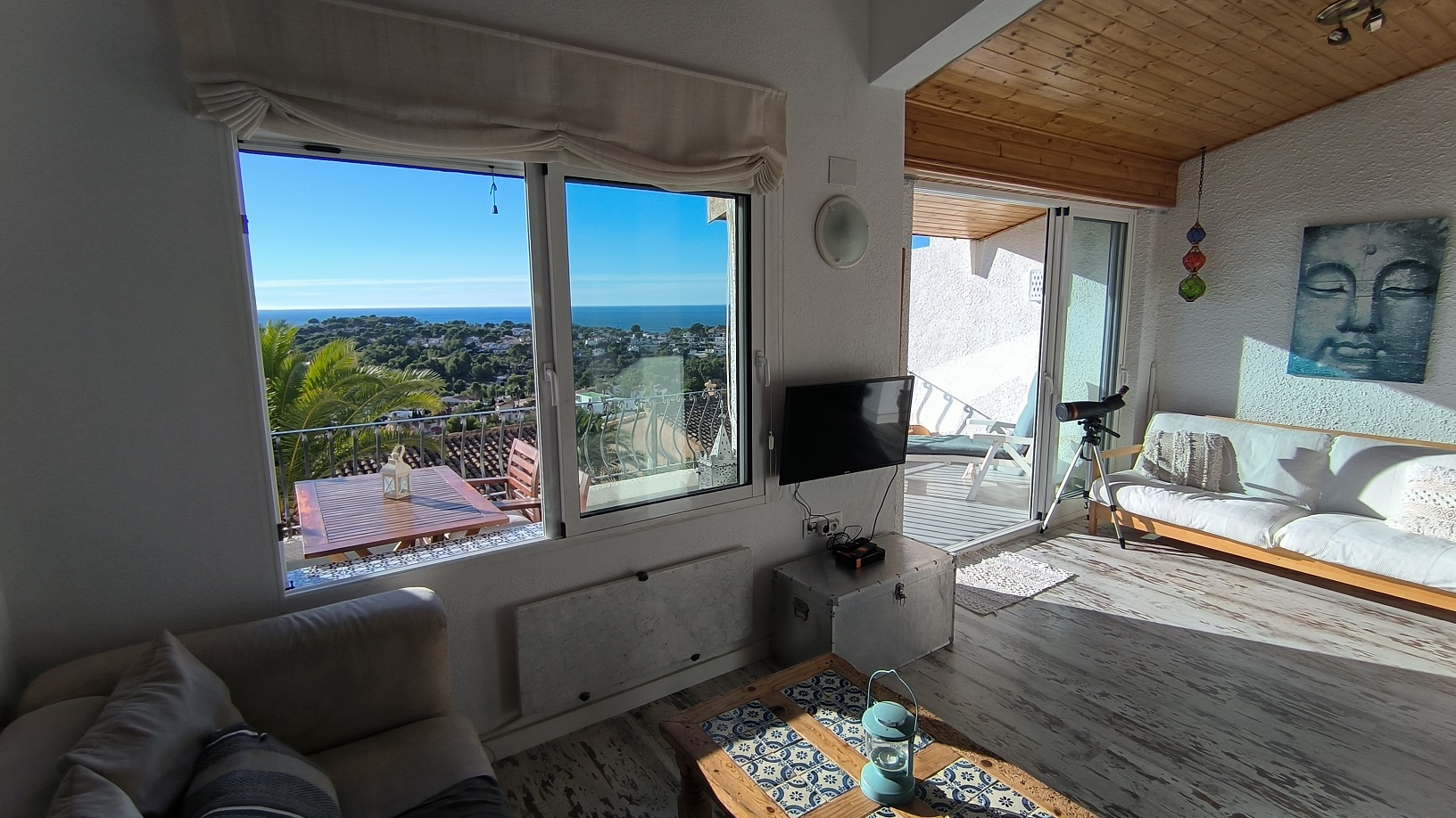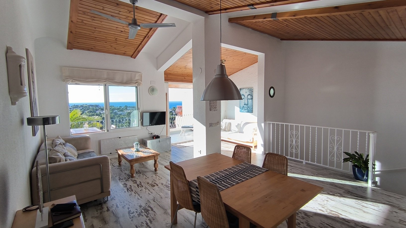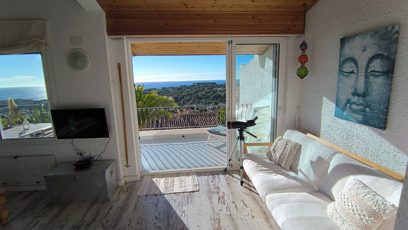 House renovated, located on a hill in a small private urbanization with shared pool, many palm trees and just 3 km. away from Moraira and its beaches with clean and cristallines waters.